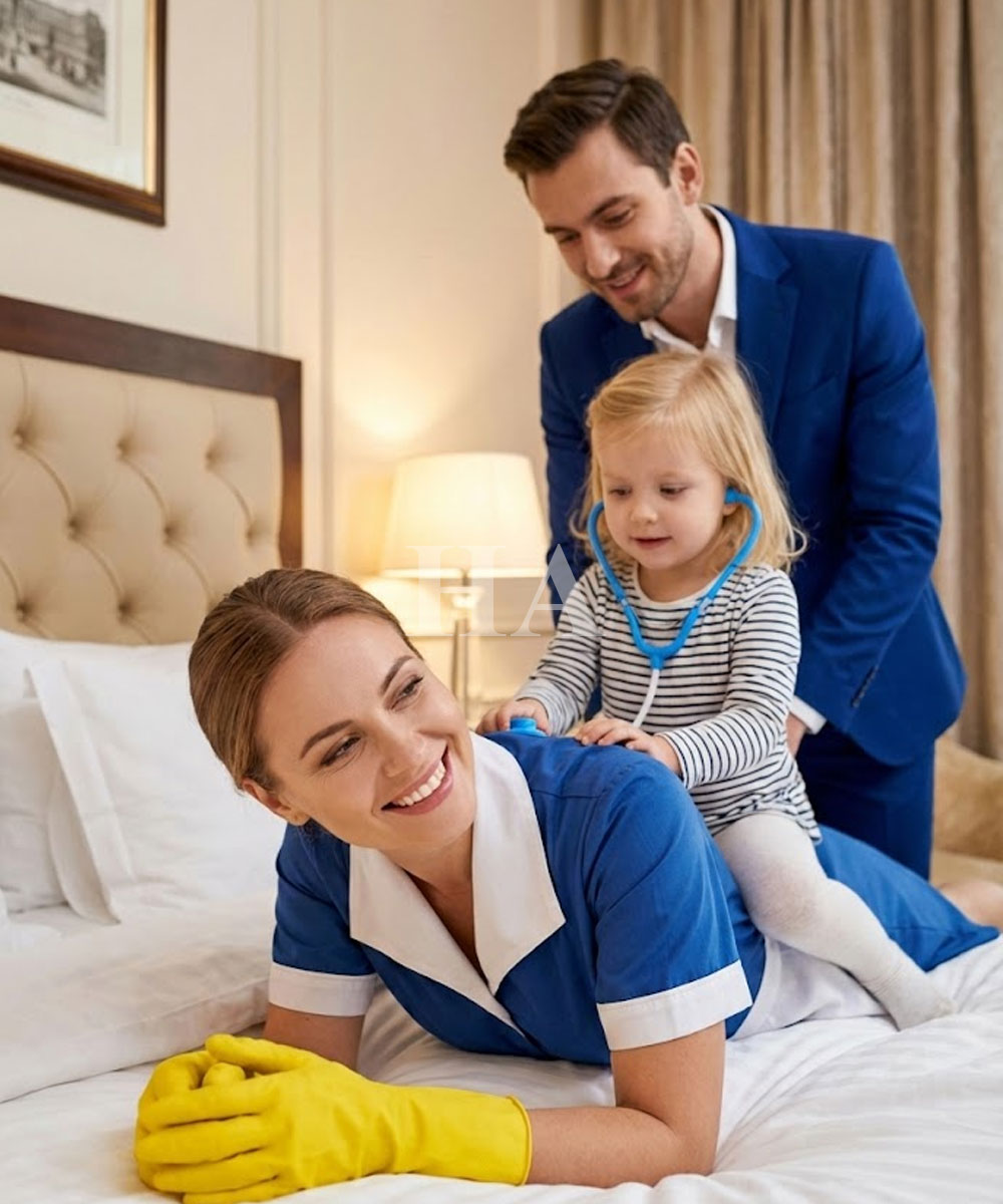 Warm light filled the room. On the center of the massive bed lay Hannah—the new cleaning woman—still wearing her faded blue uniform. Her body rested face-down on the expensive comforter, as if the bed were a place of safety rather than privilege.