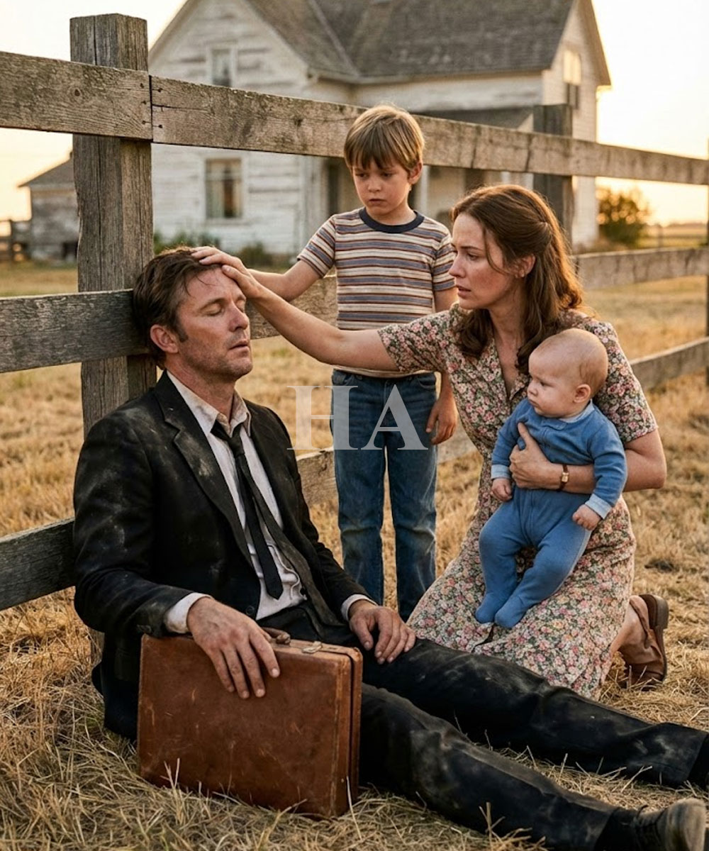 He stumbled one last time and collapsed beside a small wooden fence near a modest farmhouse surrounded by tall trees and endless fields.