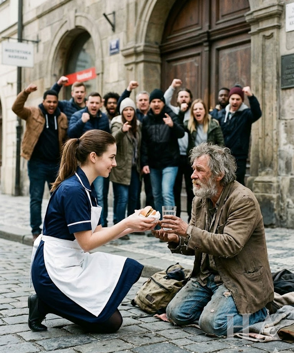 She was carrying a small tray. She ignored the calls of her superiors. She didn’t see a beggar; she saw a man.
