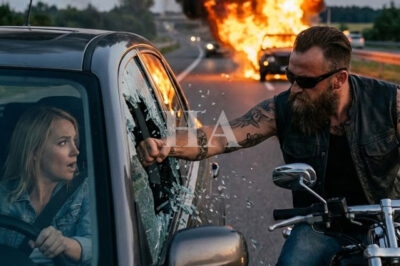 I Thought the Giant Biker Who Forced My Car to a Screeching Halt in the Middle of the Highway Was Sent to Drag Me Back to My Abusive Husband — Until He Smashed My Window, Screamed About My Tire, and the World Exploded Behind Us
