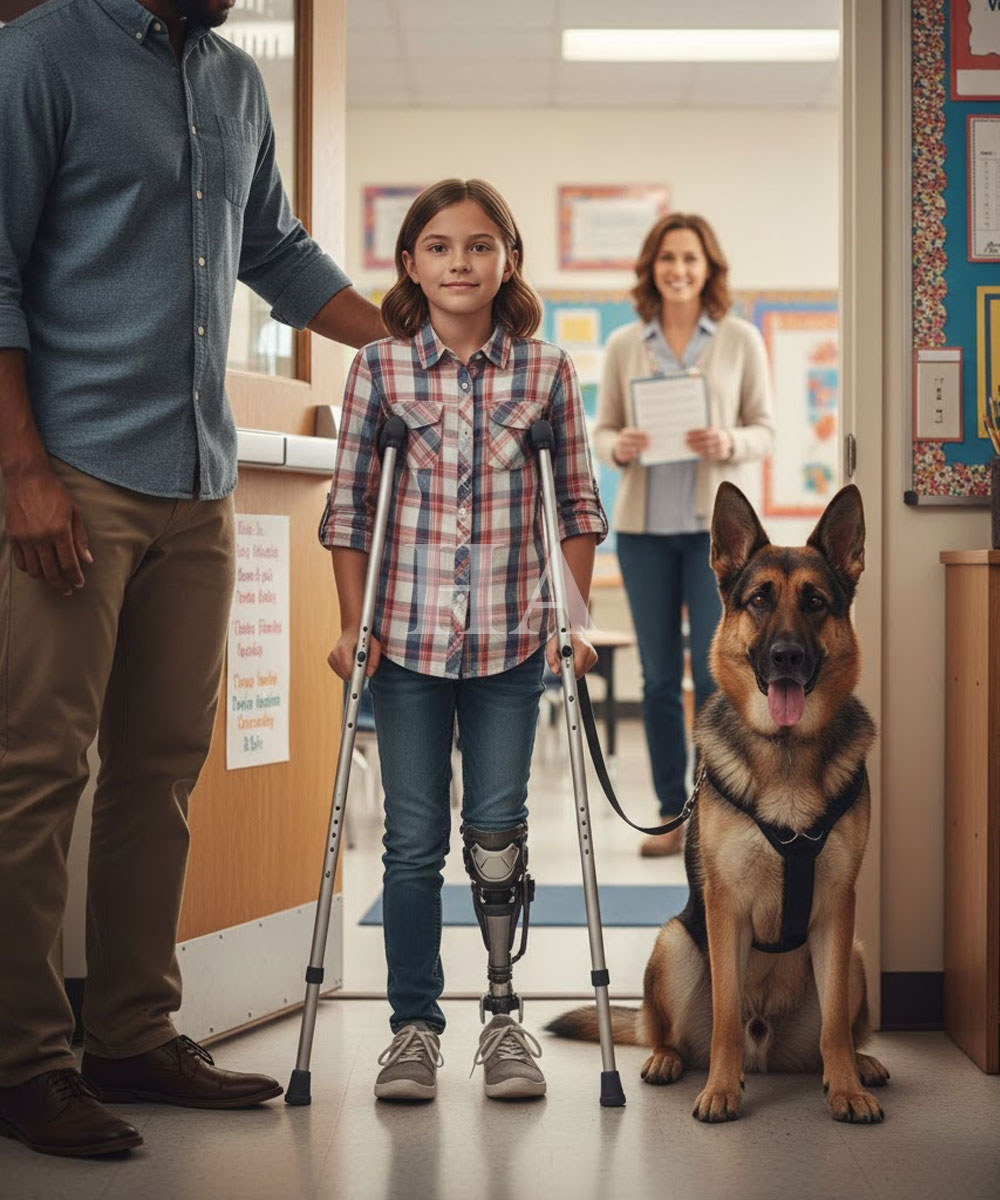 She was eight, small for her age, with light blonde hair falling to her shoulders and gray-blue eyes that always seemed to search for safety before trust. Her school uniform was simple—a cream blouse with a navy blue skirt and a matching cardigan. But it was the accessories that drew the eye: the crutches pressed neatly under her arms and the faint, dull glint of metal from her prosthetic leg catching the morning light.