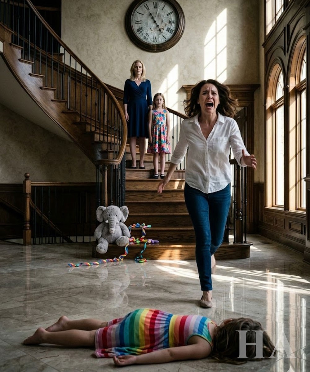 My brain refused to understand it at first. The shape on the floor by the bottom step didn’t register as my daughter. It was only color and stillness: pink shoe, brown curls, tiny arm bent under her body.
