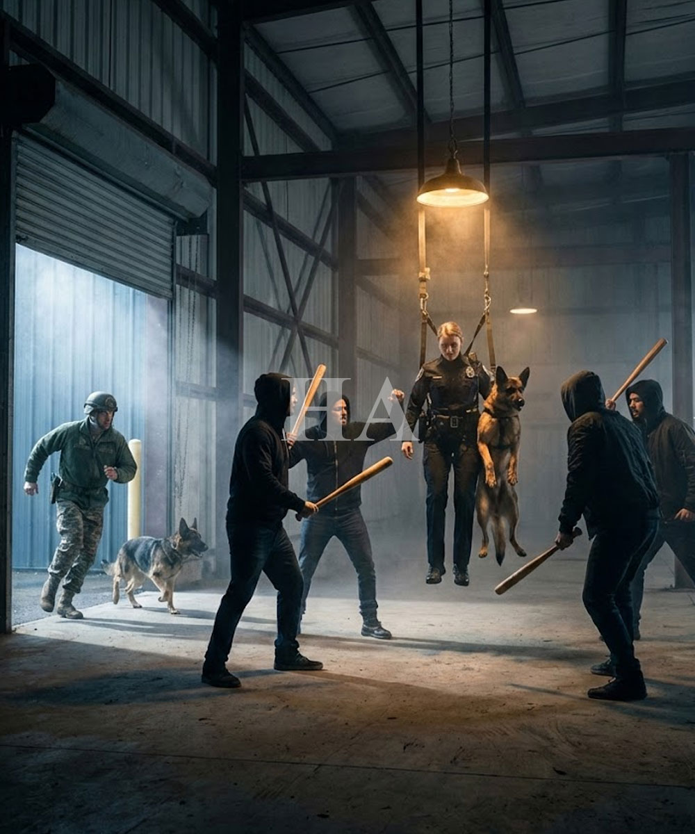 A woman—early 30s, sheriff’s deputy uniform torn, wrists and ankles zip-tied, suspended by rope from the rafters. Her K-9 partner—a lean, black-and-tan Malinois—hung beside her, muzzled, legs bound, still alive but barely moving.