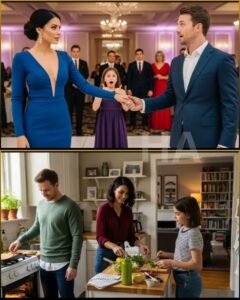 She was tall, her dark hair swept into an elegant updo, wearing a deep blue dress that shimmered with movement, as if the fabric remembered starlight. She didn’t hurry. She didn’t hesitate. She simply walked, and the room rearranged itself around her.