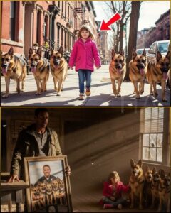 The street clock over St. Mark’s chimed seven times like a metronome every morning, and as predictably as the sun, a small figure in a bright pink coat would appear at the corner of Maple and Elm. She would walk with a dignity that belonged to someone older than her years, braids swinging, chin tilted slightly upward. At her side and in formation around her moved five full-grown German shepherds—huge, muscular, attentive—each one shaded in the half-light as if part of the dawn itself.