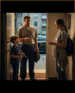 When the door opened, Adam Carter stood before her, his dark hair unkempt, sleeves rolled up, and an expression that was both cautious and kind. His eyes quickly took her in, sizing her up—not in judgment, but in the way of a father, always on alert for his child’s safety.