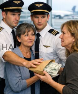 For a second, she just stared at them. Two men in crisp uniforms, shoulders squared, wings pinned to their chests, faces older and sharper than the boys she once carried through rain. Her mouth opened and closed. Her eyes filled. The crowd moved around her, but she stood still, as if the airport had become a photograph and she was the only color left in it.