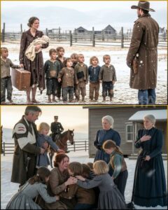 Behind Owen came Lila, twelve, clutching Caleb’s handkerchief like it could still call him back. Henry, nine, kept rubbing his hands as if friction could invent heat. The twins, Rose and Ruth, both seven, chattered through chattering teeth because silence made the cold feel louder. Clara, six, stepped down without speaking at all, a small ghost wrapped in a too-big coat. Sam, five, asked, for the hundredth time, “Is Papa here?” May, four, held his hand with a fierceness that looked almost comical on such a tiny body. And Nora, three, whimpered like a sparrow with a fever, her breath too fast for her ribs.