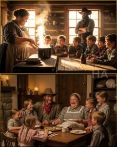 Days settled into rhythm. Clara rose before dawn, fed the stove, cooked, cleaned, tended garden and chickens, mended clothes with steady hands. The family ate together three times a day. The silence at the table began to change, not disappearing, but loosening, making room for small things: Maggie’s endless commentary on chickens with personalities and a barn cat with kittens, Noah’s questions about what made bread rise, Nora’s humming that Clara learned to echo under her breath.
