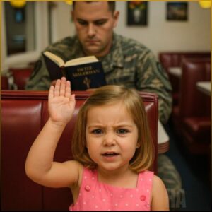 At a quiet roadside diner, a three-year-old girl curled her tiny hand into an S.O.S. signal. A soldier, seated a few booths away, noticed and casually offered her a piece of candy. The man beside her reacted instantly, striking her hard across the face. “She’s allergic,” he barked, eyes flashing. The soldier called the police, but when they arrived, the man coolly presented official documents showing he was her father. Just as the sheriff was about to back off, the little girl leaned in close and whispered four words that froze the room