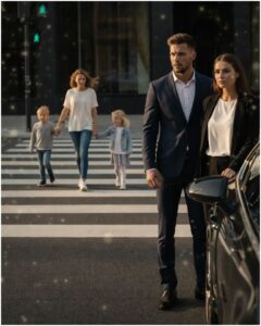 Lena reached the curb on the other side, bent protectively over the stroller to shield the children from the rain, and disappeared into the crowd like the city had swallowed her whole.