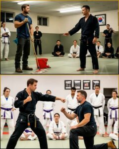 “Come on up, mop-man,” the instructor sneered, theatrically adjusting the black belt around his waist. “Let us show the newbies what a real fighter looks like.”