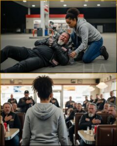 When she turned onto 5th Street, motorcycles filled the block—rows of chrome and leather, men and women standing like sentries. She considered turning back. Instead, each biker she passed stood, one by one, as if some unspoken code demanded it. The diner fell silent when she walked in. Hundreds of eyes watched.