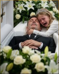 Inside, the hall was dark except for the glow of candles around Dad’s coffin. And there—lying beside him, her little head resting on his chest—was Lily. Her eyes were open but calm, her fingers clutching his sleeve.