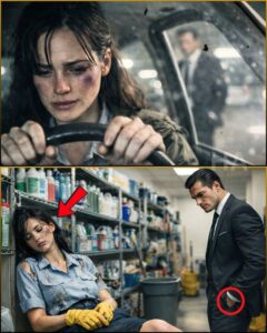 Inside, between stacked buckets and bleach bottles, a woman sat on the floor with her back against a metal shelf. Her navy janitorial uniform was torn at the shoulder, the building’s embroidered logo warped and peeling, as if even the thread was tired of holding together.