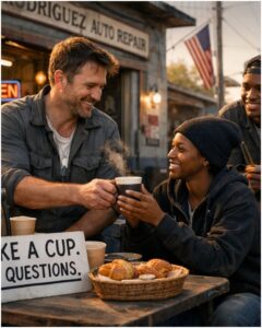 The next morning Marcus woke before his alarm, brewed coffee in a dented pot, and set out two cups out of habit. He stared at them for a moment, almost amused by how the body clings to patterns, then carried them outside anyway. One cup he drank himself, letting the heat anchor him, and the other he placed on the little table beside the sign. The street moved around him impatiently, rain tapping on metal, buses hissing at corners, life refusing to pause for anyone’s story. Marcus didn’t pray, but he stood there like he was speaking to the part of the world that tried to disappear people. Then he went back inside and raised the shutter to start his day, hands ready for grease, heart ready for whatever followed. By noon someone stopped, took a cup without speaking, and walked away fast like kindness might chase them, and Marcus pretended he didn’t notice, because he remembered how survival sometimes couldn’t afford gratitude.