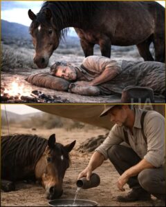 He tipped water along the horse’s lips, careful not to rush him. The stallion swallowed once. Then twice. Then shuddered and went still again, not dead, just emptied.