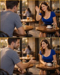The woman at the next table had her palm raised in a casual wave. She was sitting alone, angled toward me, not looking past me, looking at my face like she’d decided I existed. Dark hair glossy in the sun. A fitted cobalt blue top that matched the sky, like she dressed for confidence instead of approval. A white cappuccino cup sat untouched in front of her, foam still perfect.