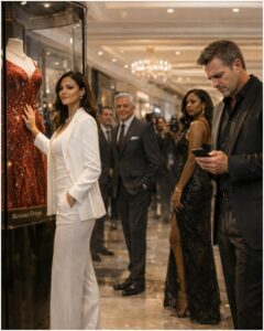 The fabric was an aggressive, molten red that looked like it had been pulled from a sunset and taught to behave. Rubies caught the light like small contained fires, each one set with the precise cruelty of perfection. A sales associate inside the boutique was speaking to someone in hushed reverence, the way people spoke near famous art, and Graham caught the phrase that made his satisfaction bloom: “one million dollars.” The number was absurd enough to sound holy. Maya’s face remained calm, almost blank, but her eyes stayed fixed on the dress as if she were looking at something that had once lived inside her and finally stepped into the world.