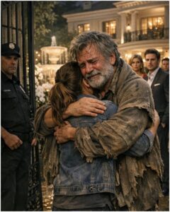 Anthony tried to hold the disguise for one more second because pride was a habit he’d worn longer than wealth. But Lucy’s arms wrapped around him, tight and unafraid, and the months of pretending collapsed inside his chest like a building finally giving up. His throat burned; his vision blurred. He hadn’t cried in decades, not since he’d been a young man sleeping in a borrowed room, telling himself tears were a luxury for people with safety nets. Lucy didn’t care who was watching. She didn’t care that he smelled like the streets and old fabric. She clung to him the way a person clings to the last reliable thing in a world that keeps shifting. “I’ve been looking for you,” she said, voice breaking, and the sincerity of it punched through the air. Around them, the fountain strings went quiet, the chatter dissolved, and people began to understand what had just happened. This wasn’t security removing a stranger. This was a family rejecting their own blood in front of cameras and orchids and a sky full of stars that didn’t care.