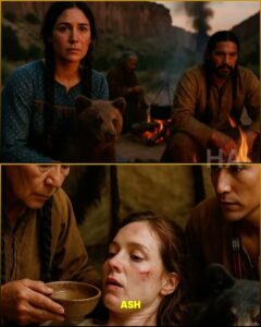The lodge around her was small but warm. Furs lined the walls. A child’s rattle lay in the corner like a forgotten promise. Near the fire, curled in a tight heap, was the bear cub.