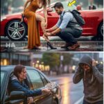 He stumbled from the driver’s side, half-falling out, his suit torn and darkened by rain. His face was pale in the light, his eyes too wide, his breath carrying the unmistakable stink of scotch and expensive mistakes.