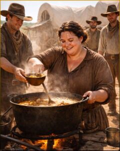 Abigail worked from before dawn until after dusk, scrubbing the chuck wagon, reorganizing supplies, patching sacks, sorting dried beans from pebbles, rationing flour, and mapping in her head what fourteen hungry men would need over six weeks in hostile country. Trail cooking, she knew, was not merely food. It was morale. It was rhythm. It was a reason for men to keep behaving like human beings instead of weather-beaten animals with opinions.