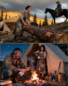 Not a short piece, either. Full length, heavy with sap, the kind of timber two men would wrestle and then swear at for the trouble. She had a rope looped over one shoulder, boots biting into rocky earth, skirt hem soaked with mud to the knees. Her calico dress was faded with washing and hard living. A gust hit her and tried to push her back down the slope, but she leaned into it as if she’d made a private agreement with the wind and intended to keep her side.