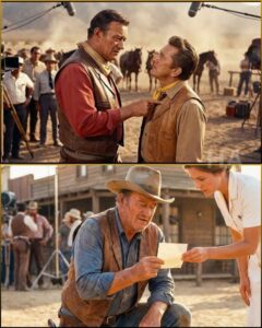 The director, Don, called for the first setup, and his voice was calm the way you speak in a hospital room. Simple scene, no dialogue: Books walking down the main street, letting presence do what words couldn’t. “Quiet on set,” the assistant director said, and thirty people obeyed as if silence was a form of respect you could hold in your hands. Wayne stepped to his mark, the dust already clinging to his boots, and Lola started toward him with powder and a cloth. There was sweat on his brow and they hadn’t even rolled, but he lifted a hand and waved her off, not rude, just firm, like he was protecting the last scraps of control he still owned. “Roll camera,” Don said. “Speed. Action.”