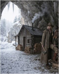 Inside the cave, she laid down a base of stone, a rough floor. She built a door frame at the entrance and hung a thick plank door that opened inward. She lined the interior walls with timber she’d treated and positioned tight, then packed clay between the boards until it sealed like hardened earth. She fashioned partitions that created two rooms: a sleeping space tucked deeper inside, and a living space closer to the mouth where a stove could breathe.