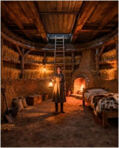 That night, Nora didn’t dig. She mixed and plastered, her hands covered in white paste, smoothing it over clay walls by lantern light. The pit became a vault. The air in it changed, less damp, more crisp. Over the next days she hauled flat stones from the creek bed and fitted them together on the bottom like a puzzle. Over that she laid thick dry planks. She built ladder rungs into one braced wall, testing each one twice.
