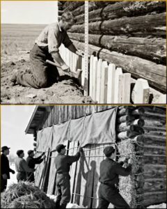 That night the air was mercy. The grandfather’s breathing eased; the baby’s cough softened; the Morrisons stopped burning furniture. Fuel use per person fell by thirty percent compared to their previous consumption. Eirik taught them quickly and without ceremony—lash a temporary plank skin eight to twelve inches off the windward wall, stuff loose straw or hay into the gap, hang blankets inside, and make a vestibule. It was not elegant work. It was desperate and plain as hands. Harwick did the first retrofit on his north wall with bailing wire and rough boards. In forty-eight hours his pre-dawn interior temperature rose twelve to sixteen degrees. That was enough to stop frost where it had been forming every night.