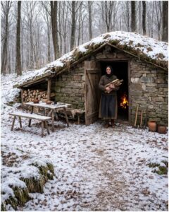 She built the firebox against the west wall using dense river stone that wouldn’t crack under heat. The chimney was short, just enough to draw smoke without pulling all the warmth out with it like a greedy mouth. She made two small windows on the south wall and covered them with oiled canvas to let light in without inviting wind. The door was thick pine set deep into a stone frame, fitted tight enough that the first time she shut it, she felt the difference in her bones.
