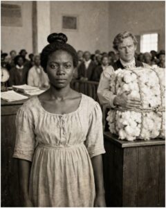 Silas Rourke announced, “A fine house servant, sound, steady, and yes, gentlemen, she reads. A rare convenience for correspondence.” He said it quickly, like a man slipping a ring into his pocket, and then he added the strangest part, the detail that made whispers scatter through the hall like startled birds. “Minimum bid, one bale of cotton.” Elias heard someone chuckle in disbelief, and someone else mutter, “That can’t be right.” In Charleston, an enslaved woman with household skills could fetch hundreds, sometimes more, and even men who pretended morality was optional understood numbers. One bale of cotton was not a price, not really, but a signal.