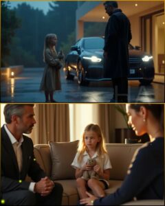 A sleek black car swept up the drive, slicing through the rain. Sophia froze, watching the figure behind the wheel. The man’s face, lit for an instant by lightning, looked carved from calm itself. Strong jaw, tired eyes. The kind of man who had never known hunger.