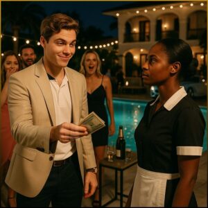 One summer night, Ethan invited friends over for a lavish poolside party. The music was loud, champagne bottles popped, and luxury cars lined the driveway. By midnight, Ethan was already drunk, his ego soaring as he entertained his guests with ridiculous dares. When Maya entered the patio to clear the glasses, Ethan smirked at her.