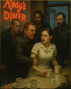 “Fine,” he spat. “Coffee sucks anyway.” He knocked his cup so the coffee sloshed, and his men laughed too loud to cover their backpedal. They pushed through the door into the rain, dropping a curtain of curses that sounded like boys whistling in a graveyard. Their taillights smeared red as they fishtailed out of the lot, then they were gone—just thunder and wet asphalt and the diner exhaling all at once.