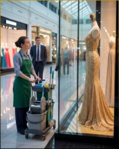A cleaning cart rolled quietly along the marble, guided by a woman in a gray uniform. The cart’s wheels made almost no sound, but Alex noticed anyway because his eyes had always been drawn to anything that didn’t belong. She stopped near the window display, a little to the side, as if she wanted to look without being seen looking. Her posture was composed, work-trained, but her attention lingered on the dress with a stillness that felt… personal.