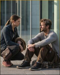 A man sat against the far exterior wall just beyond the glass, half shielded by a construction barrier and a stack of flattened cardboard. Most people would not have seen him unless they were looking for what others preferred to ignore. His beard was gray and overgrown, his coat too thin, his posture rigid with the effort of conserving heat. One hand clutched a piece of cardboard with the words ANYTHING HELPS written in neat, almost careful lettering. The handwriting struck her first. Not shaky. Not sloppy. Deliberate.