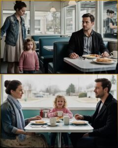 The bell above the diner’s door jangled like a small apology when Grace pushed it open. A gust of November air followed her in, scattering a few last leaves across the linoleum floor. She drew Lily closer, tucking the child’s tiny mittened hand into the crook of her elbow. The warmth that met them felt almost indecent—soft amber light, the smell of coffee, butter, the steady clatter of dishes. For a moment Grace let herself pretend they were just another pair of strangers stopping in for pancakes.