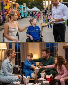 Ten minutes later, they were at Civic Center Park — neon lights from taco trucks reflected in puddles, laughter and music floating through the air. Arlo’s chair glided easily over the concrete path, and for once, nobody stared.