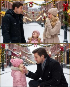 His chestnut hair was dusted with snow, his blue-gray eyes wide with shock. He looked older, sharper — every inch the millionaire CEO he’d become — but those eyes… they hadn’t changed.