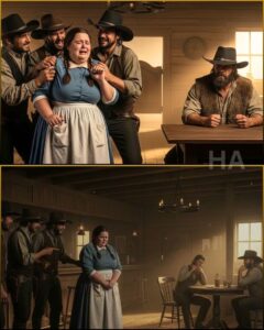 It came first as a rough blur, carried across the empty afternoon like a thrown rock. Boots followed, heavy on the wooden steps, careless in a way sober men rarely were. Clara’s hands went still on the counter. She didn’t need to see them to know what kind of laughter it was, the kind that wasn’t born of joy but of hunger. Hunger for sport, for dominance, for the thrill of making someone else feel powerless.