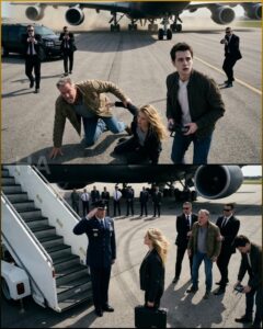 The great blue-and-white plane came in low and enormous, engines pressing against the chest, the landing gear thundering onto the runway with controlled violence. Paper plates and napkins flew across the tarmac. Children cried. Adults stumbled backward. Black SUVs poured into motion from three directions.