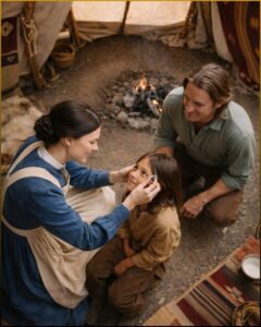 Within minutes they had brought a beaten metal dish, and Samuel himself held it where the morning sun poured bright onto Daniel’s face. Eleanor washed her hands, cleaned the skin around the child’s eyes with boiled water and cloth, and explained every step so he would not be frightened.