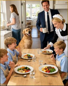The boys stopped eating. Four sets of eyes snapped to him, wide and watchful. They didn’t look startled so much as… trained. As if someone had taught them how to become small when danger entered.