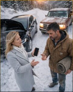 A rusted Ford F-150 came out of the blizzard like something too stubborn to die. It pulled alongside the wreck and stopped. The driver’s door opened, and a man climbed out, broad-shouldered, bundled in a patched parka, face hidden behind a balaclava and snow goggles. He took in the situation in one sweeping glance, went to his truck bed, grabbed a crowbar, and crossed to the Ether X without hesitation.