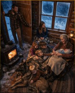 The family fell into the cabin with the graceless desperation of the nearly frozen. Nathan kicked the door shut against the storm. The sudden hush felt unreal, like surfacing underwater. Cold still clung to them, but it was survivable now. Atlas moved forward, not aggressively, but with firm, quiet authority, positioning himself between the family and the door. The smallest boy stared at him, then clutched a fistful of the dog’s fur as though Atlas were part animal, part furnace.
