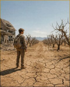 He walked between two rows, his boots crunching over hard-packed earth and dead weeds. The soil looked tired. The trees looked worse. Up close, the bark was split in places, the limbs brittle, the irrigation lines cracked or buried under dust. He crouched and pressed his hand against the ground. It felt hot and unyielding, like it had forgotten that softness was ever part of its job.
