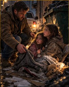 They were huddled together on flattened boxes and torn blankets, curled so tightly into each other they looked like one frightened creature split into two bodies. Both were filthy, shivering, and far too still for children. Their hair, dark and curly, was tangled with dirt and leaves. Their cheeks were pale with cold. Around each of their necks hung a small silver locket, dull with age and grime.